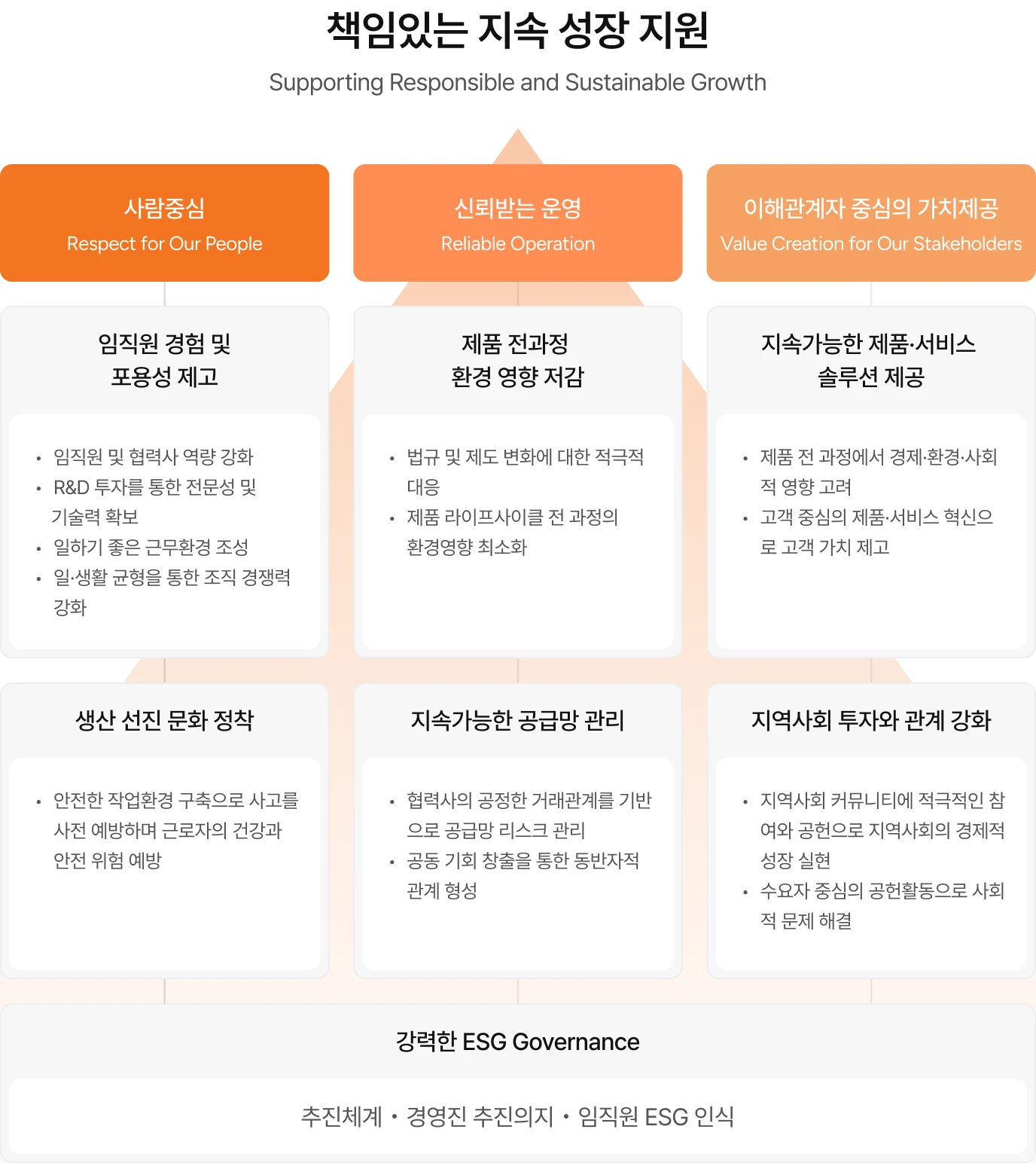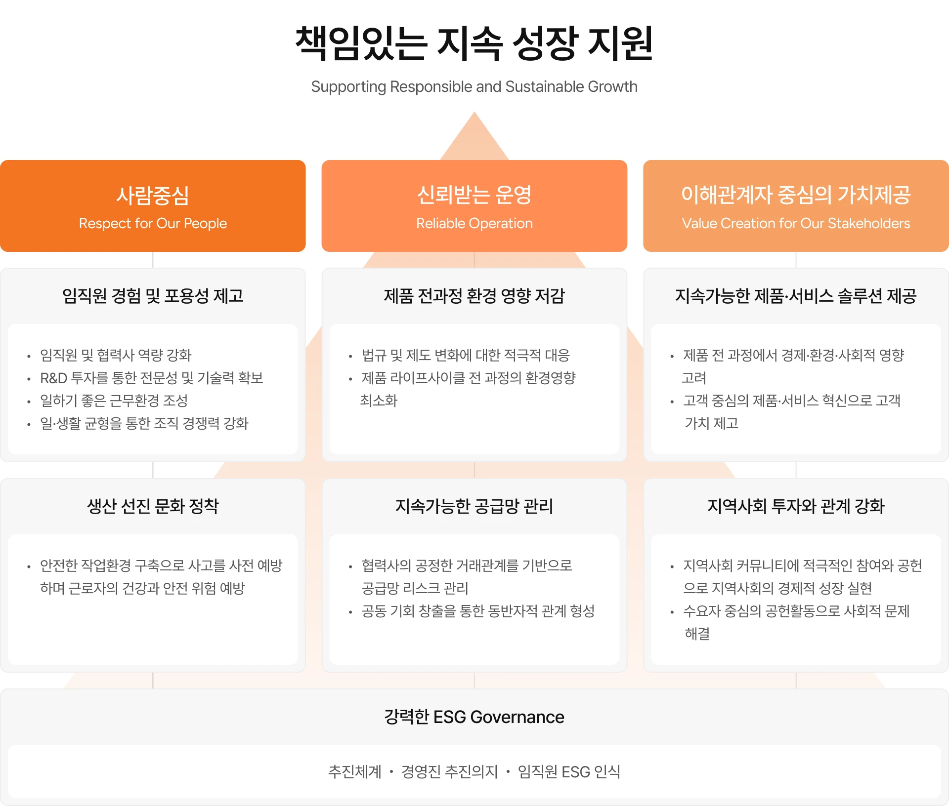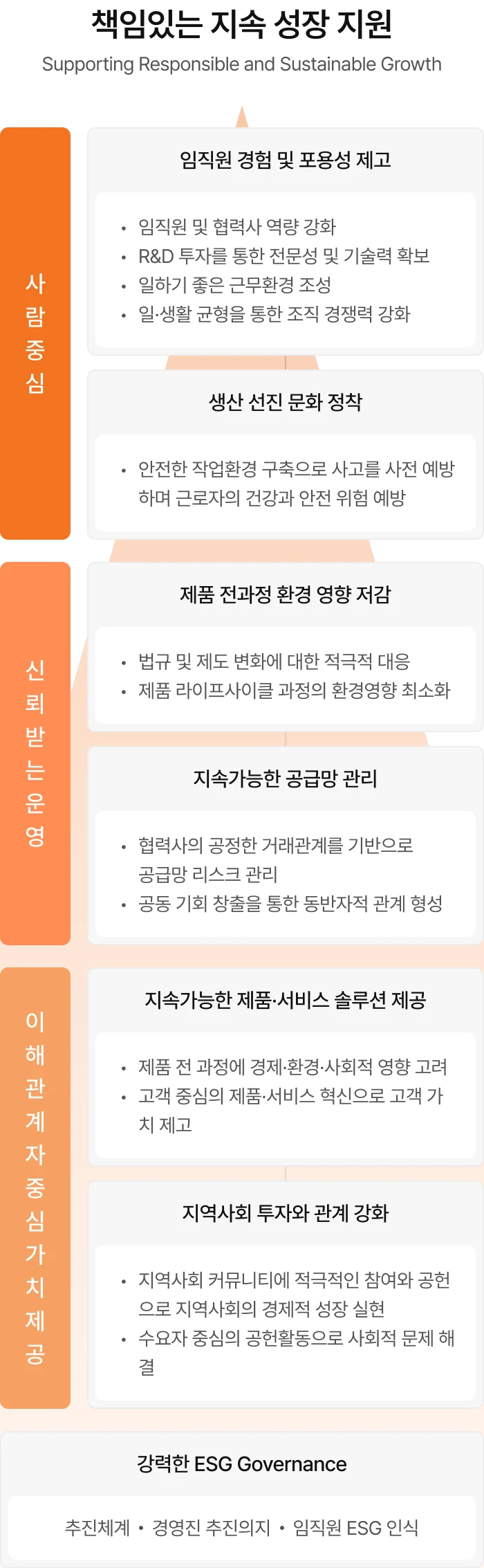 ESG 전략체계 - 책임있는 지속 성장 지원. 사람중심, 신뢰받는 운영, 이해관계자 중심의 가치제공을 기반으로 강력한 ESG Governance를 구축합니다.